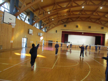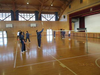 • 2年生は保健体育でバドミントンを行っています。今日はダブルスの形式で練習を行いましたが、あちこちのコートで長く息の合ったラリーが続いていました。シャトルを上手に打ち返す生徒たちの姿です。卓球部に所属している生徒は、日頃の部活動で培ったラケットの操作感覚やタイミングの取り方が非常に上手で、そのスキルが存分に発揮されていました。