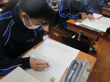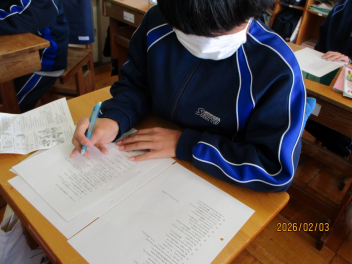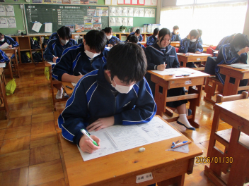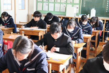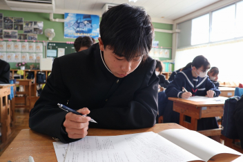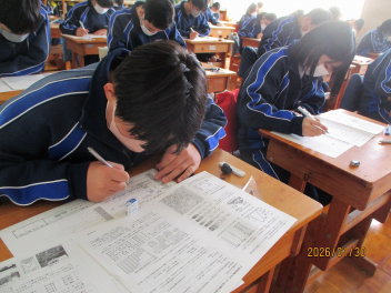 • 1、2年生の学年末テストが行われました。 朝、いつもより早く登校した生徒たちが、教室で友人と問題を出し合ったり、最終確認をしたりする姿が見られました。試験が始まると、静まり返った教室に鉛筆の音だけが響き、真剣に問題に向き合っていました。一問一問に真剣に向き合う表情からは、この1年の成長が感じられました。