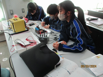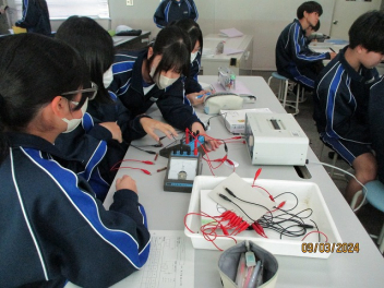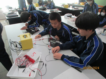• 2年生の理科の授業では、合成抵抗の学習に取り組んでいます。 生徒たちは回路図を読み解きながら、実際に実験回路を組み立てていきました。試行錯誤を繰り返しながらも、測定器具を駆使して正確な数値を導き出そうと、熱心に実験に取り組んでいました。