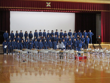 • 3年生の式歌練習が体育館で始まりました。 より良い合唱を目指し、音楽の先生の指導に熱心に聞き入る生徒。その真剣な表情やピシッと伸びた背筋から、卒業に向けた意気込みが感じられます。本番に向け、さらなる成長が楽しみです。