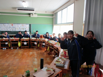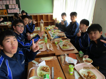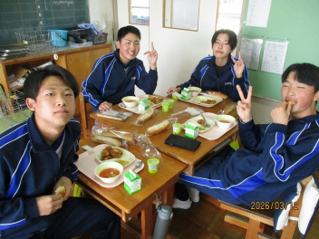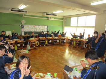 3年生にとって、今日がついに「最後の給食」となりました。 最後を飾る献立は、生徒たちに大人気メニューの「唐揚げ」でした。仲の良い友達とグループを組んだり、クラス全員で大きな輪を作ったりと、思い思いのスタイルで最後のひとときを楽しみました。大きな口で唐揚げをほおばっていました。