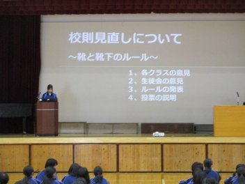 • 生徒会が半年間かけて検討してきた「校則の見直し」がいよいよ佳境を迎えています。12月の学級討議の結果を受け、今回は「靴・靴下」に関する提案が全校に共有されました。これから行われるアンケートの結果をもとに、みんなでルールを決めていきます。今日まで半年間、試行錯誤を繰り返しながらリードしてくれた生徒会役員の皆さん、本当にありがとうございます。
