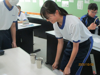 • 慣性の法則の特徴は外部からの力が働かなければ、運動している物体は同じ速さで同じ運動を続けることです。生活のいたるところで慣性が働いています。実験ではコップとテーブルクロスを使った実験などを行っていました。コップが動く前にすばやくクロスを引きぬいてしまえば、摩擦が生じる時間が少なくなり、慣性の法則が成立しやすくなります。他にも慣性が働いている場面を探してみてください。