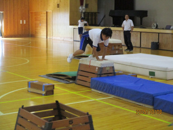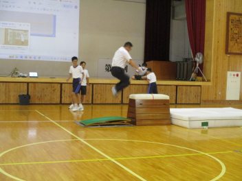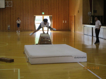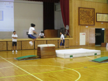 跳び箱運動に取り組む様子です。自分の跳び方をタブレットで撮影して、見本動画と比較しながら調子よく跳ぶことができるように練習に励んでいました。一人ひとりのレベルに合わせて高さを決め、友達とアドバイスしながら楽しく練習していました。校長先生も生徒と一緒に踏切の練習を行いました。生徒以上に高く跳んでいて驚きの歓声があがっていました。