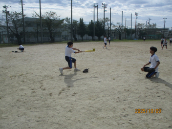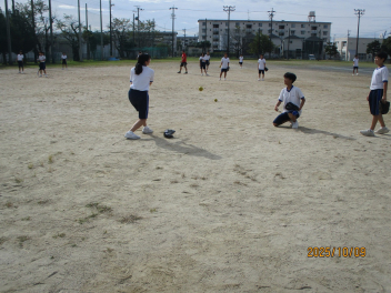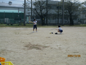 • 2年生はベースボール型の球技に取り組んでいます。最初に守備練習の導入として様々なボールでキャッチボールの練習をしました。その後、基本的なバット操作の練習をグループごとに取り組んでいました。ボールは柔らかいスポンジボールなので怖がらずに練習していました。バットにボールが当たると大きな歓声があがっていました。