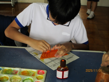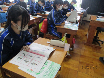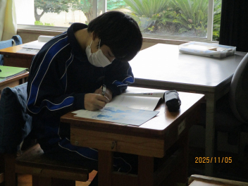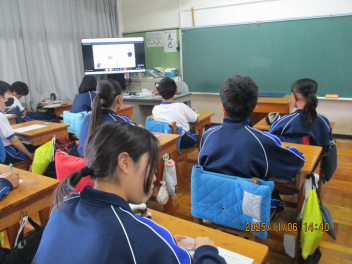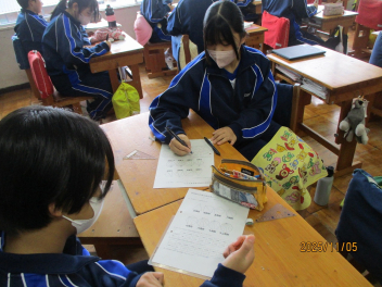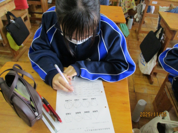 3年生は定滑車と動滑車を用いた仕事の原理を実験で見つけていました。定滑車の片方に二つのおもりをつるし、もう片方に一つのおもりだけで釣り合うようにするにはどのようにすればよいか、試行錯誤しながら見つけていました。釣り合わない班が多かったですが、粘り強く実験に取り組んでいました。「気象」と言っても、色々なものを含む言葉です。2年生は気象の学習で「天気」や「風力・風向き」、「気温」、「気圧」、「湿度」などを実験器具を用いて調査していました。器具の数値を確認しながらワークシートにまとめていました。