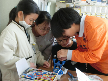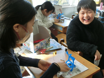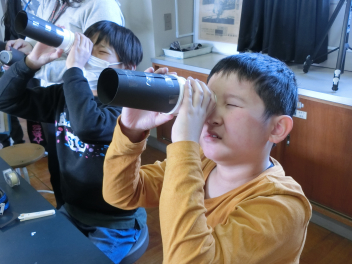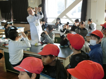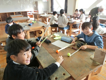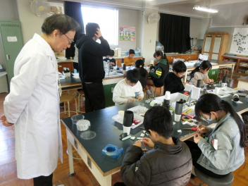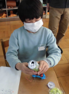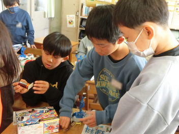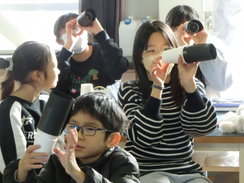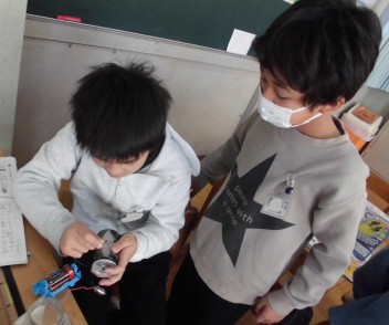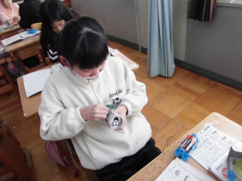 • 先日、理科の時間に、電気を通す物、通さない物を調べる実験をしました。始めに、テープを乾電池に貼り、その上に導線をつなぐと明かりがつくかどうか予想しました。「テープは薄いから電気を通すよ。」「テープが電気の通り道をさえぎっているから、明かりがつかないよ。」などと、2つに分かれました。その後、身の回りの物について予想してから実験しました。「明かりがついた!」「え⁈つかない!」と驚きの声。中には、2枚のアルミ箔に導線をそれぞれにつけた場合、アルミ箔が重なっていれば明かりがついたが、離れていると明かりはつかないという発見をした子もいました。
