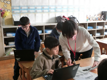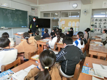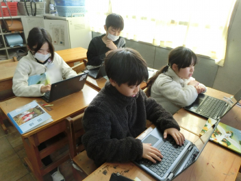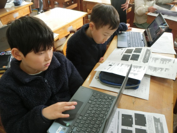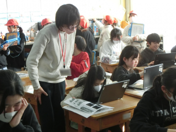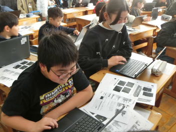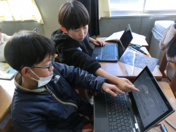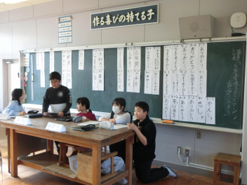 • 国語の学習では、タブレット画面を見ながら、みんな真剣