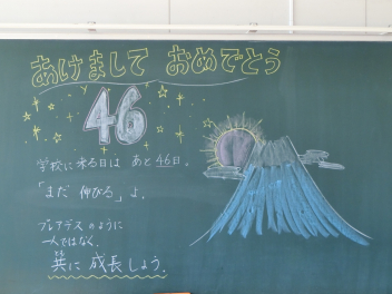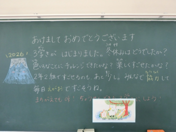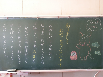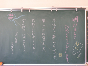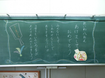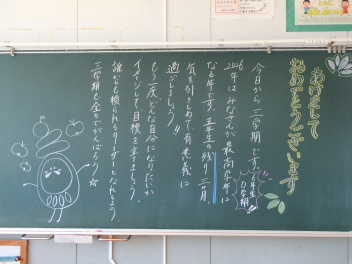各教室の黒板には、竹っ子たちを迎える言葉が