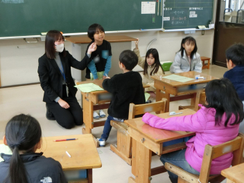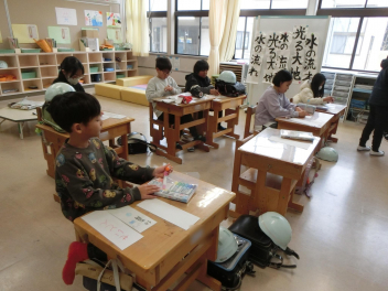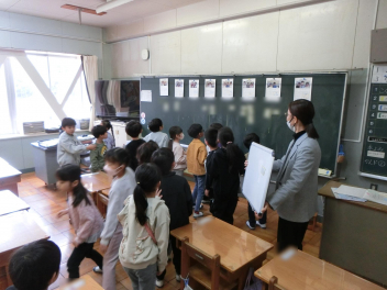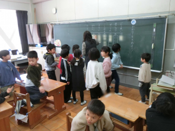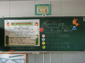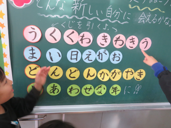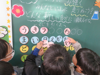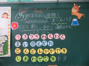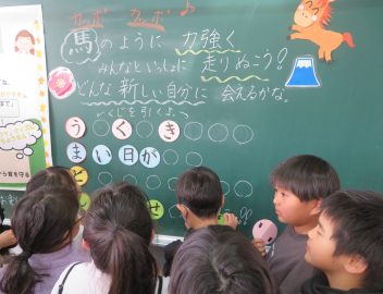 •  元気な子供たちが教室に戻ってきました。どの子も「かがやき」いっぱいの顔です。早速、馬クイズに挑戦。そのあと、1人1枚カードをひき、黒板に貼りながら「う・ま・ど・し」に続く言葉を作りました。
