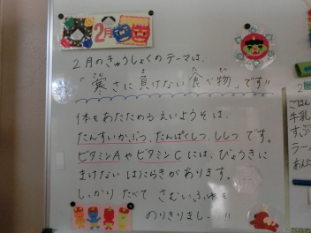 2月の給食のテーマ「寒さに負けない食べ物」を食べて体を温め、
