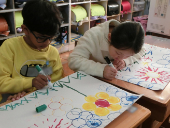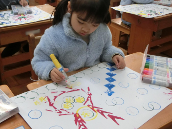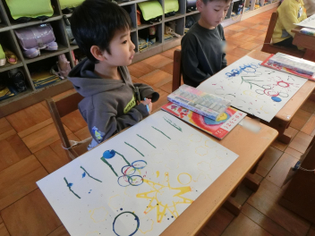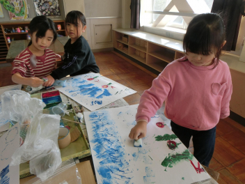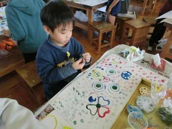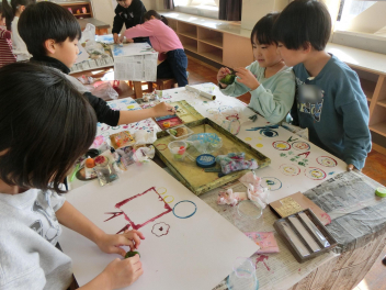 いろいろな物に好きな色の絵の具を付けて、ペタペタ写していきます