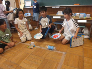 青空へ向かって飛ばしたカラフルな風船たちを見て、「これが積志まで飛んできたんだ。」と実感する子供たち