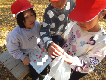 「まつぼっくり、どこで見つけたの?」とチームごとに情報交換しながら、たくさんの秋を見つけることができました。