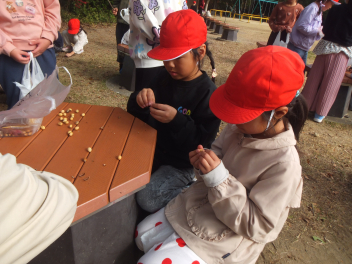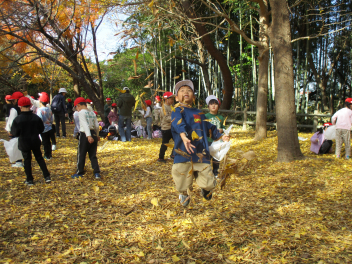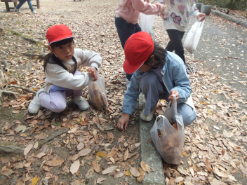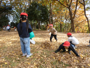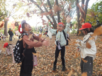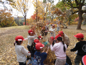 グループで協力して赤や黄色の葉っぱや木の実などを見付けたり、秋見つけのビンゴをしたりしました。また、落ち葉を集めて山を作ったり、どんぐりに葉っぱを巻き付けて洋服にしたり、ごろごろ転がったりと秋を楽しみました!