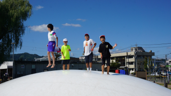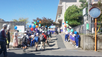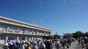 青空へ向かって飛ばしたカラフルな風船たちを見て、「これが積志まで飛んできたんだ。」と実感する子供たち
