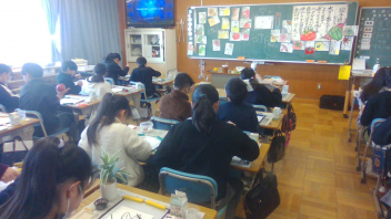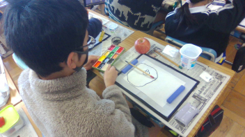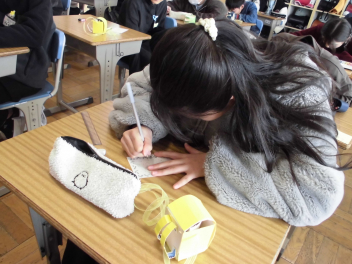 卒業記念品の絵手紙作成では、どの子も和紙からはみ出るように大きく絵を描き、心温まる文を添えて完成させていました。