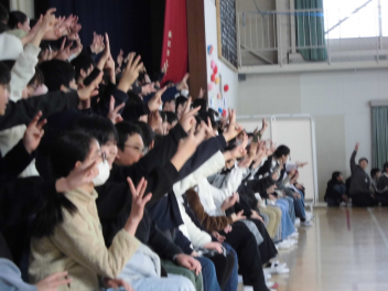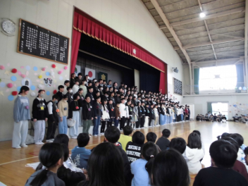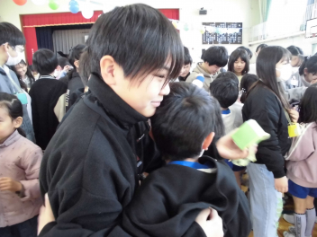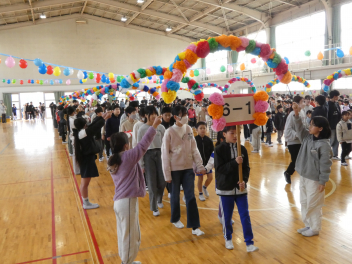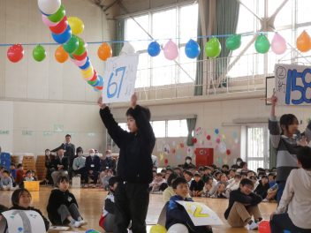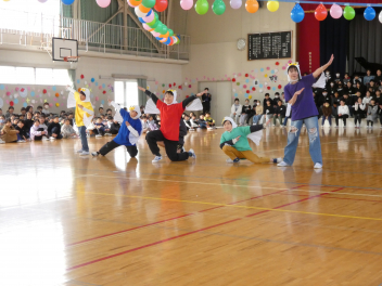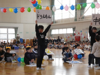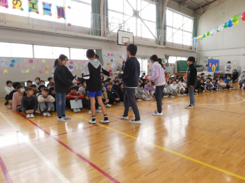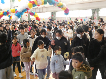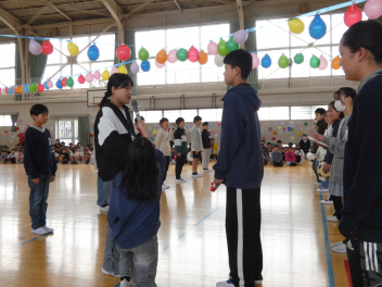 •  全校児童が集まり6年生を送る会を行ってもらいました。感謝のメッセージや歌、劇、クイズ、プレゼントなどたくさんの内容で6年生は笑顔で楽しく過ごすことができました。また、他の学年の出し物のときは笑顔や拍手で見たり、一緒に歌ったりしました。学年の切り替わりの時には、静かに見守る姿が6年生としての成長を感じることができました。