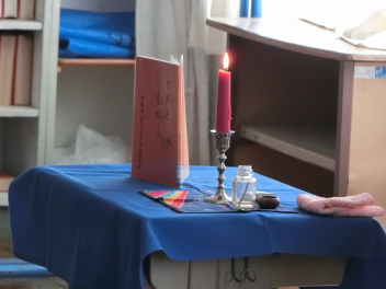 赤いロウソクに火を灯し、おはなしの世界に入っていきます。