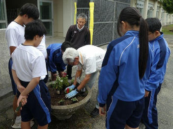 8組さんと9組さんが、南校舎横の花壇のお手入れをしています。