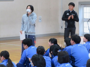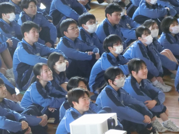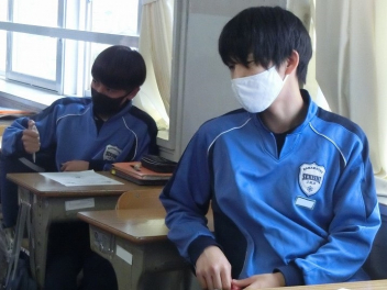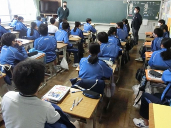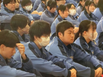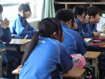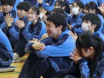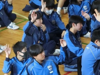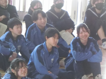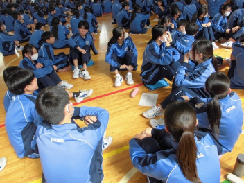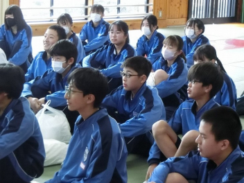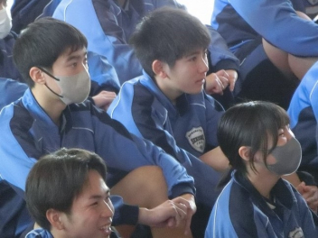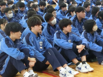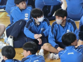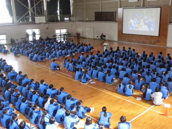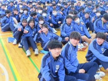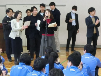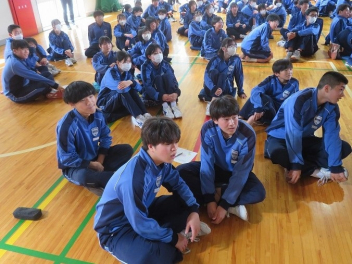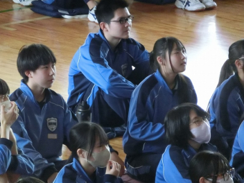 3年生は、体育館で異動された先生方からのビデオメッセージを見ました。