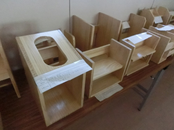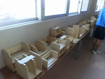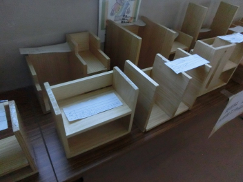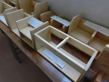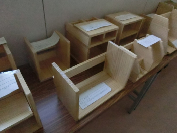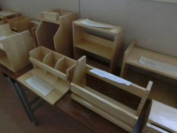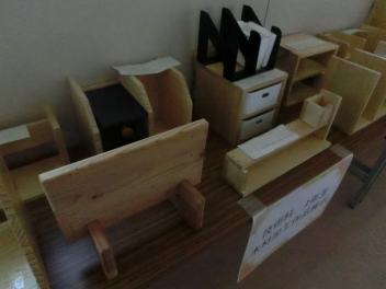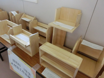 現在、北校舎2階の廊下に木工作品を多数展示しています。