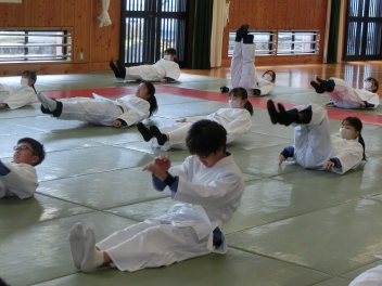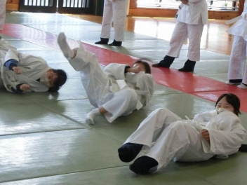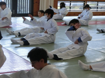 後ろ受け身、左右の受け身、前受け身、前回り受け身など、けがをしないように受け身をしっかりと練習します。
