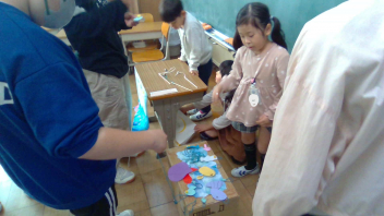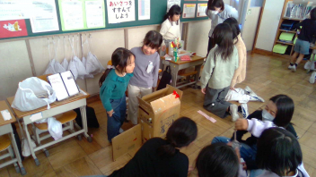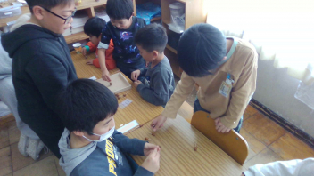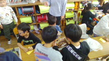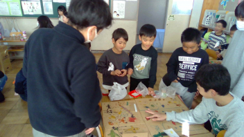 • 1年生が生活科の学習「たのしいあきいっぱい」でどんぐりやまつぼっくりを使って、秋のおもちゃを作りました。どのように材料を使ったらみんなが楽しめるかを考え、こまやけん玉、迷路などを製作し遊び方を工夫しました。ペア学年の6年生を招待しました。