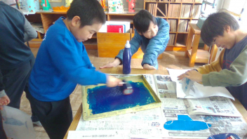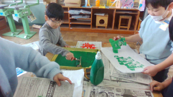 図工の「いろいろうつして」紙版画の学習では、いよいよ刷る活動が始まりました。鮮やかに色がつく瞬間が楽しかったですね。