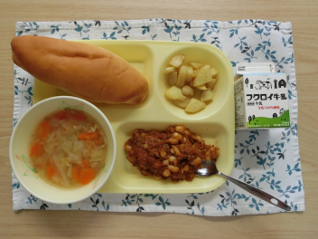 昨日から給食がスタートしました。今日の献立は、パン、牛乳、チリコンカーン、アルファベットスープ、じゃがいものす揚げでした。3学期もおいしい給食を楽しみにしてください。