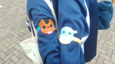 授業で作成した手作りのふれあいバンドを身につけ、少し緊張しながらも笑顔で出発しましたsmiley