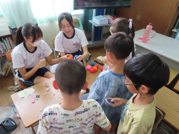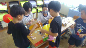 「どんな商品なら売れるか」「どのくらいの価格がちょうどよいか」など考え、商品(スライムや折り紙、キーホルダー等)を販売するために、小学校へ出向きました