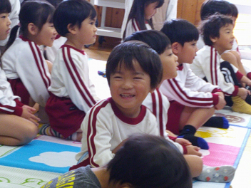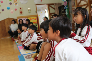 遊戯室に集まって、園長先生のお話や保健の話を聞いたり、