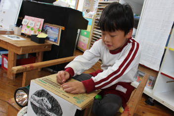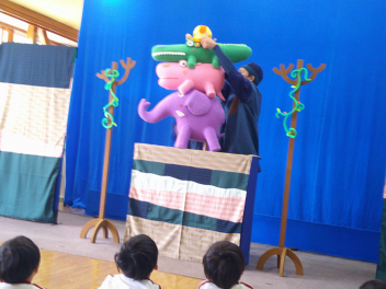 今日は交流保育で草笛会による人形劇を上阿多古小学校で見ました。
