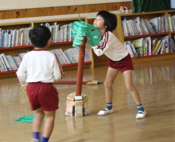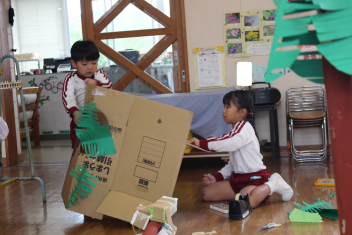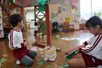 ほし組さんともり組さんは先日大成功に終わった屋台を解体しました。解体した屋台の柱や屋根、太鼓をリサイクルしてこれからの遊びに活かしています。どんな遊びに発展してくのか楽しみです。wink