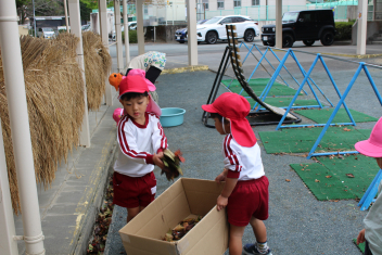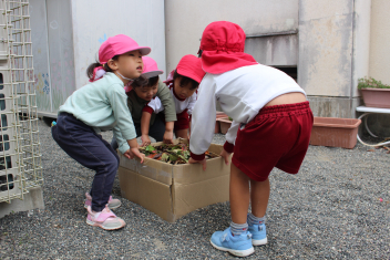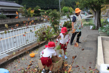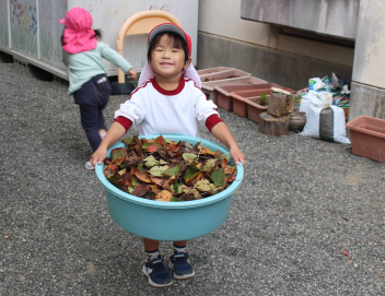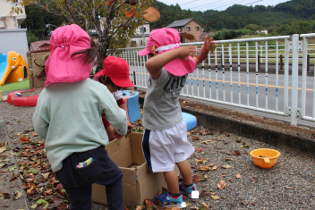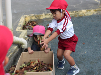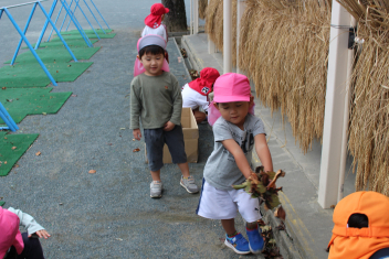 はな組さんともも組さんは戸外で落ち葉を集めてまき散らして今の時期しかできない遊びを楽しみました。