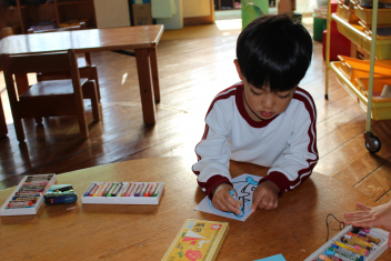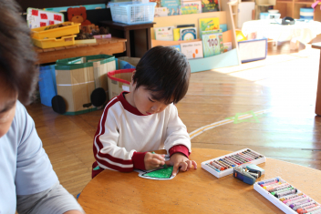 はな組さん、もも組さんが楽しそうにクレヨンで色塗りです