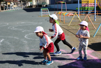 少し肌寒かったですが、元気いっぱい戸外で体を思い切り動かして遊ぶことを楽しみました