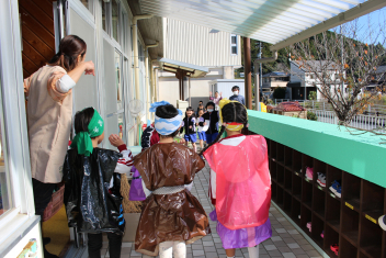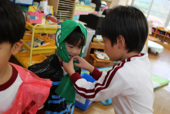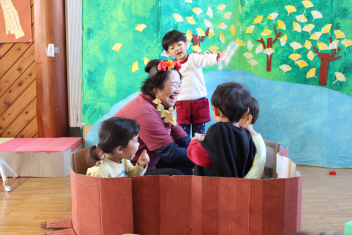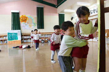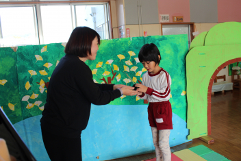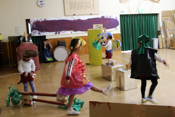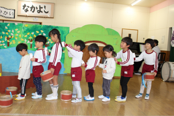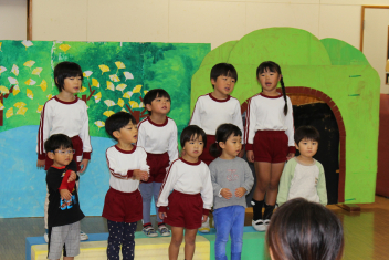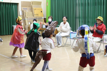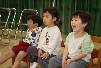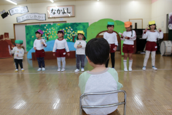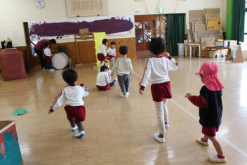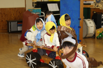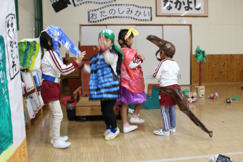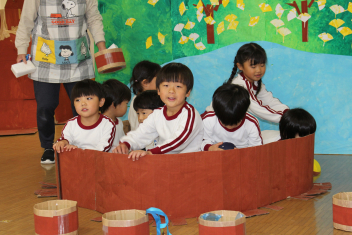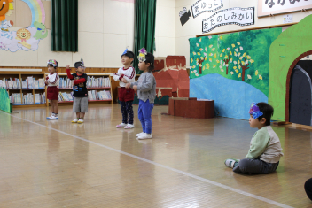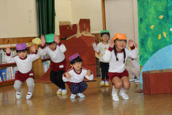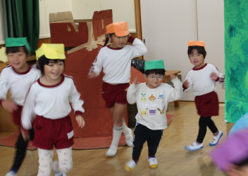 次は、はな組もも組の『トンネルを抜けると…』です。トンネルを抜けると、いろいろなものに変身してしまうはな組・もも組さん!みんなで一緒に踊ったり、運転手さんや動物になりきったりして思い切り楽しみました