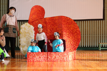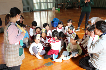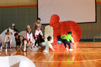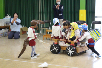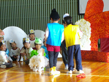 お弁当の後、熊幼稚園の友達が遊んだ劇遊び「てぶくろ」をみんなで遊びました。