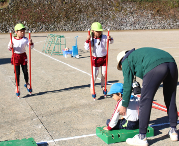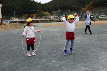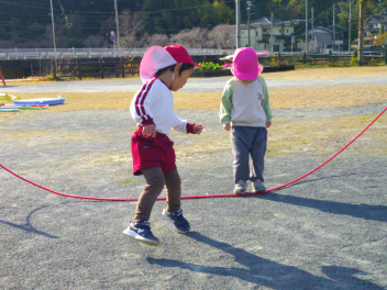 園庭で縄跳びやスイングスキップ、〇△□鬼をしたりして遊びました。sad