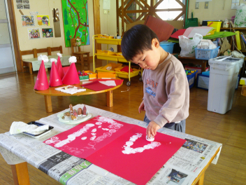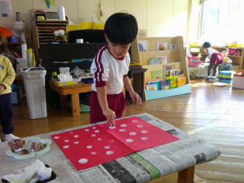 はな組さん、もも組さんは、芋ハンを使ったスタンプをしたり、折り紙を糊で貼り付けたりしてかわいく飾っていきました!