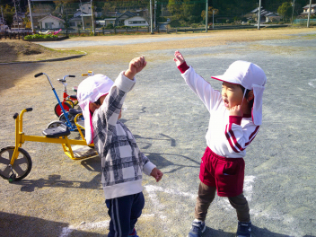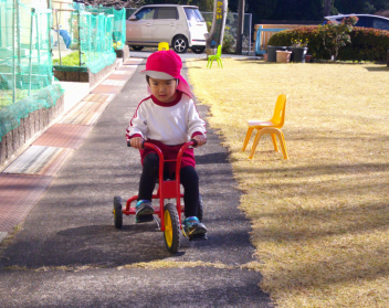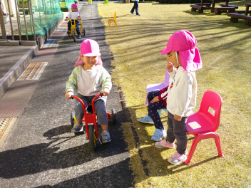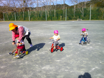 外でもいっぱい遊んだはな組・もも組の様子を紹介です!今日も、三輪車や〇△□鬼などで、体を動かして遊びましたsad