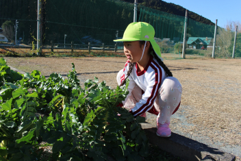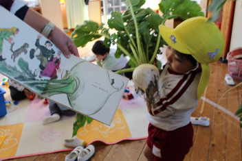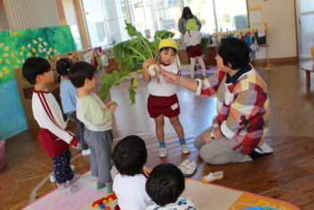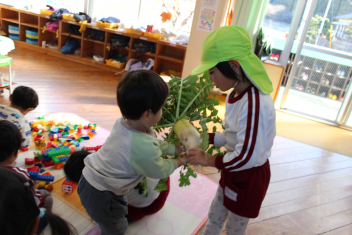 野菜の重さも感じながら保育室へ運び、年少組・満3歳児に