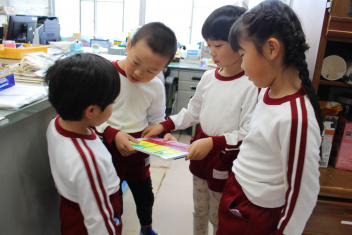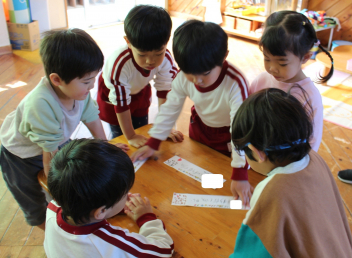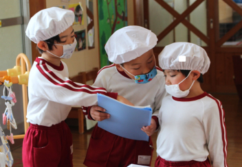 毎日、お休み調べに来てくれている年長組さんにもう一人一緒に来ている友達がいました。よーく見てみると年中組さんでした!どうしてか聞いてみると「僕たち卒園すると、お休み調べをする人がいなくなってしまうから。年中組さんと一緒にやるんだ!」と教えてくれた年長組さんです。wink年中組さんの顔を見ながら丁寧に教える姿が見られ、ほほえましく思いました。laugh
