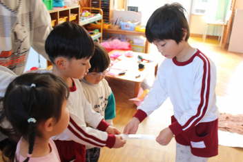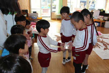 • 「そういえば、年長組さんに明日のことお知らせしていなかった!!」と気が付き、年長組さんに明日のチケットをみんなで渡しました!喜んでくれるかドキドキでしたが、うれしそうな年長組さんを見て満足げな年中・年少・満3歳でした。wink