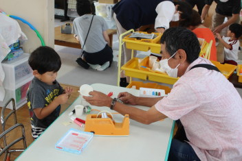 当日は前半は遊びコーナー:年長・年中が考えつくりました!「魚釣り」「恐竜的当て」、