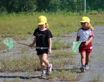 網を片手に園庭中を駆け回り虫探し!「あっ!いたいた」と飼育ケースに入れるときは友達と慎重に入れる姿も見られました。