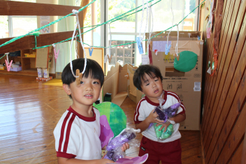 年少・満3歳児は自分でつくったトンボで遊んだり、フウセンカズラの種を