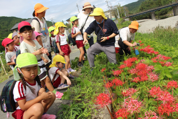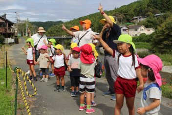 その後、みんなで下阿多古の地域探検(阿多古川の堤防)にでかけました!